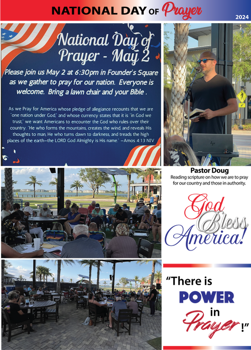 We were honored to host a prayer service down at Founder's Square for National Day of Prayer. A number of people showed up to pray for our nation and those who serve our country. We also prayed for those in leadership in all areas of our lives. Then we prayed for those who are special in our lives along with those neighbors around here in Babcock Ranch. What a special time to come together and pray with others. There's POWER in prayer.